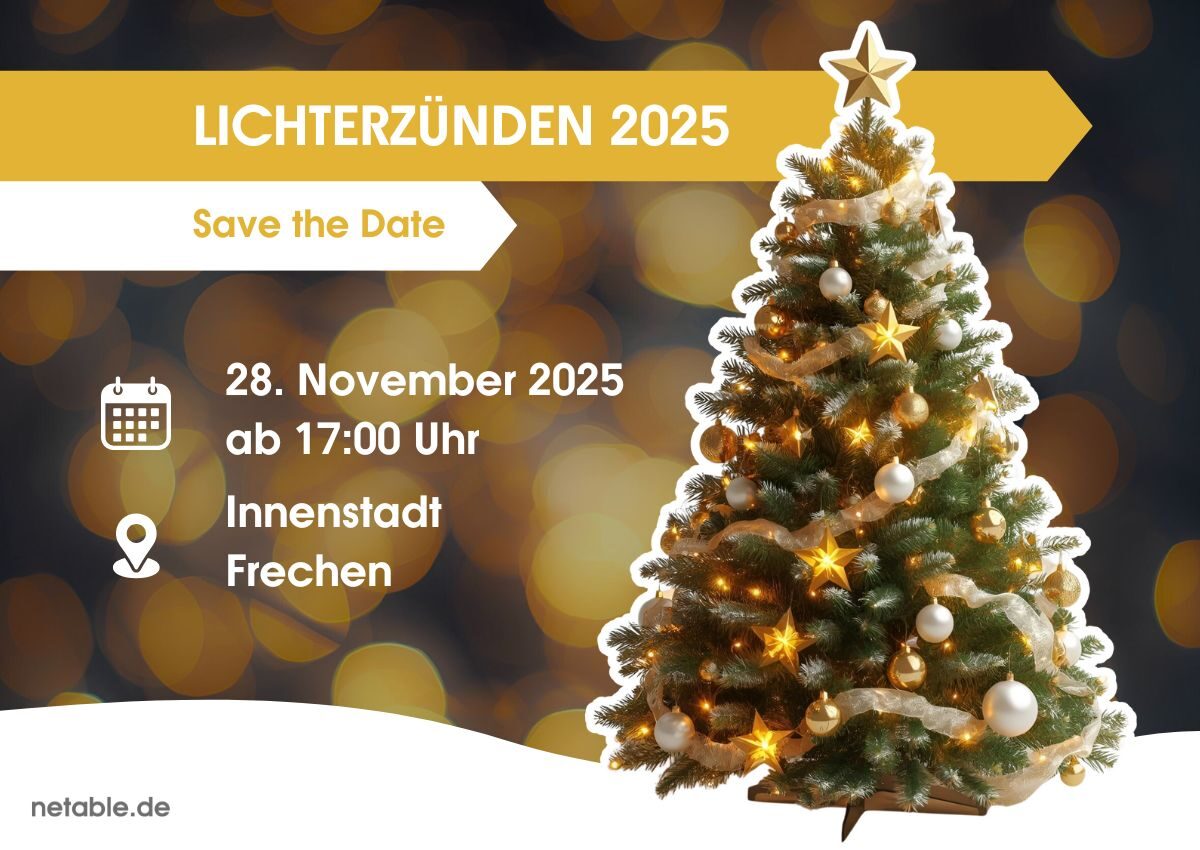 Auch in diesem Jahr wird’s wieder festlich in der Frechener Innenstadt! Am Freitag, den 28. November 2025, laden wir Sie herzlich zum traditionellen Lichterzünden von netable ein. Freuen Sie sich auf einen stimmungsvollen Abend mit Musik, weihnachtlichen Leckereien und dem feierlichen Erstrahlen des Weihnachtsbaums!